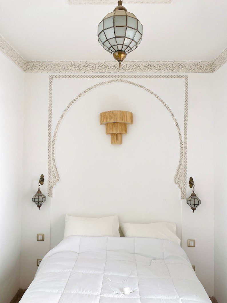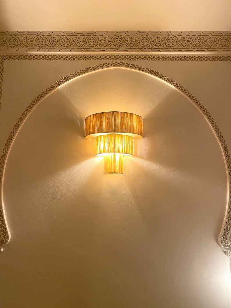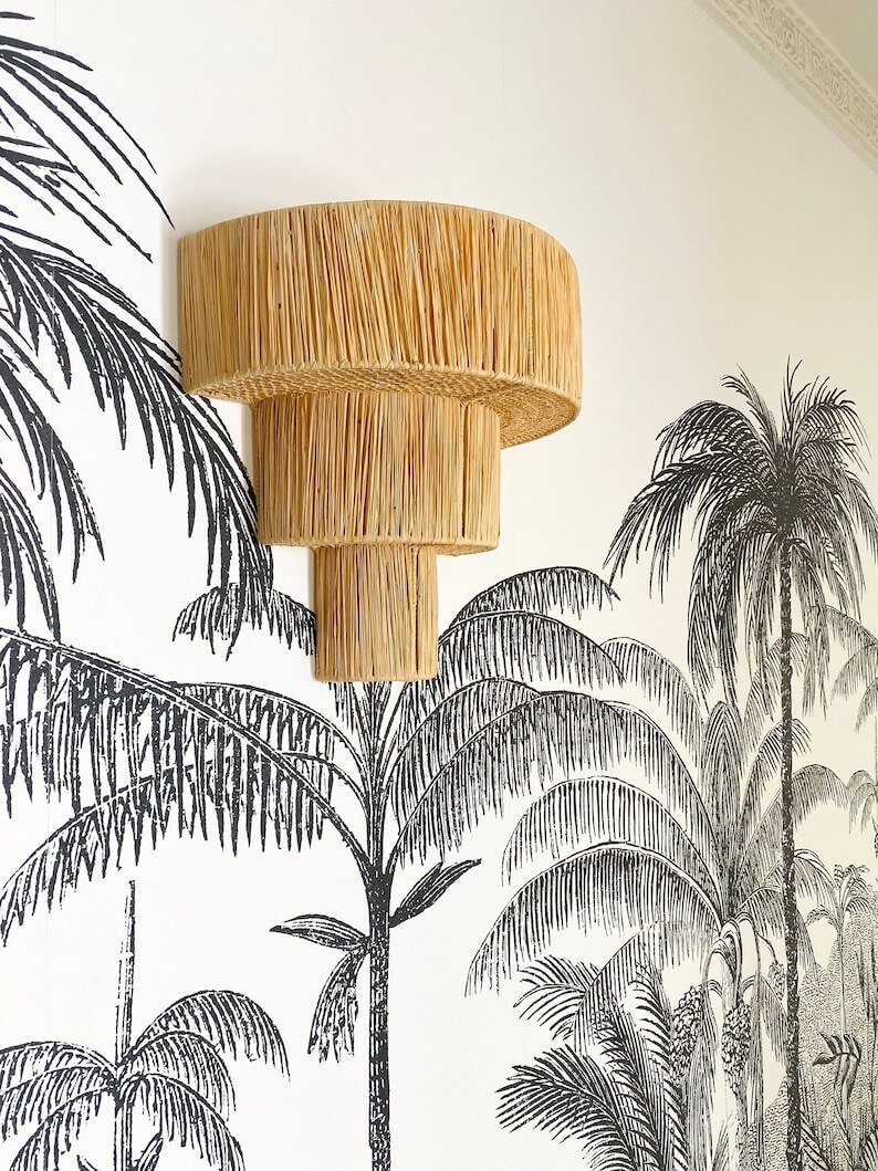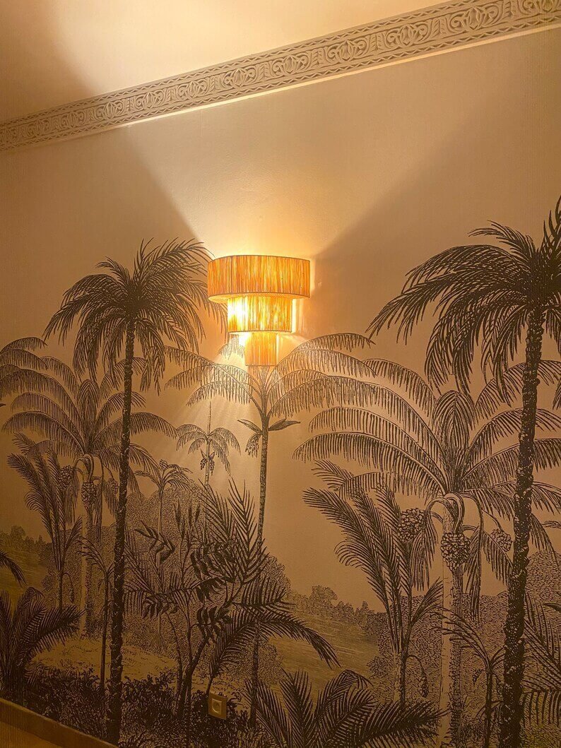 Applique Murale Triple en Raphia – Éclairage Naturel Fait Main Ajoutez une touche chaleureuse et artisanale à votre intérieur avec cette Applique Murale Triple en Raphia. Fabriquée à la main à partir de raphia naturel, cette applique murale unique se compose de trois abat-jours qui créent un bel effet superposé, apportant profondeur et texture à n'importe quelle pièce. Avec son style naturel et organique, elle est parfaite pour les intérieurs bohèmes, rustiques ou minimalistes. Mesurant 35 cm de large, 20 cm de profondeur, et 45 cm de hauteur, cette pièce est à la fois décorative et fonctionnelle, offrant un éclairage doux et ambiant. En raison de sa fabrication artisanale, chaque luminaire peut varier légèrement en couleur et en dimensions, rendant chaque pièce vraiment unique. Dimensions :- Largeur : 35 cm