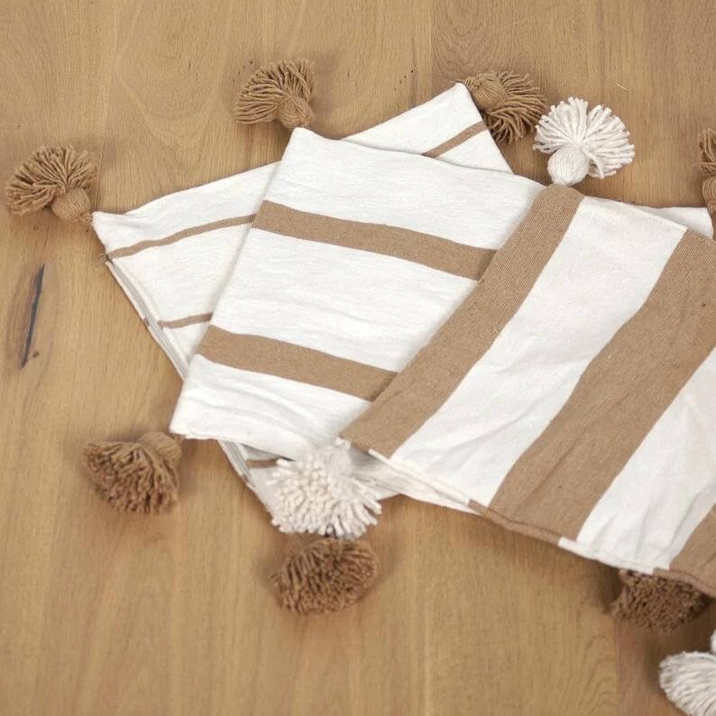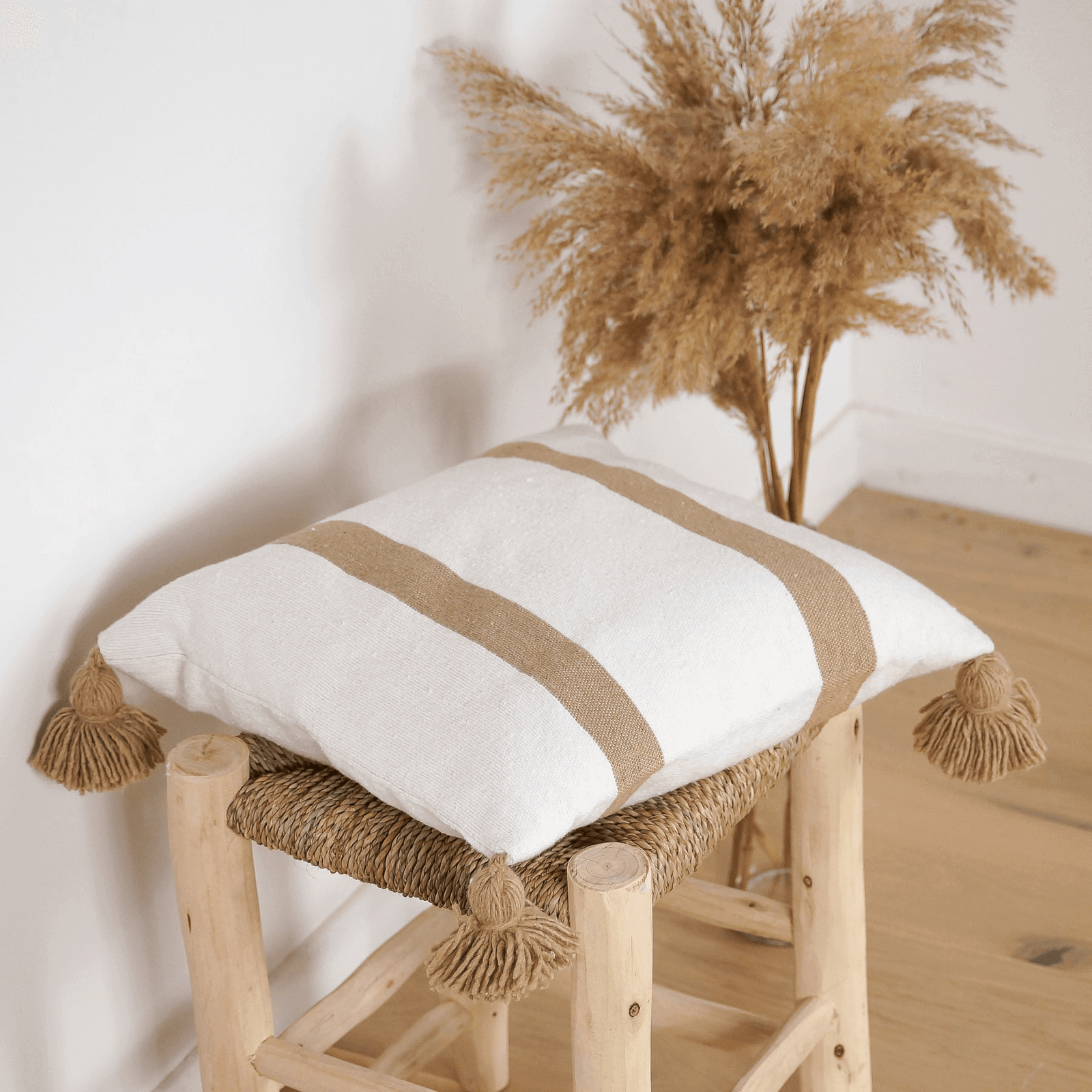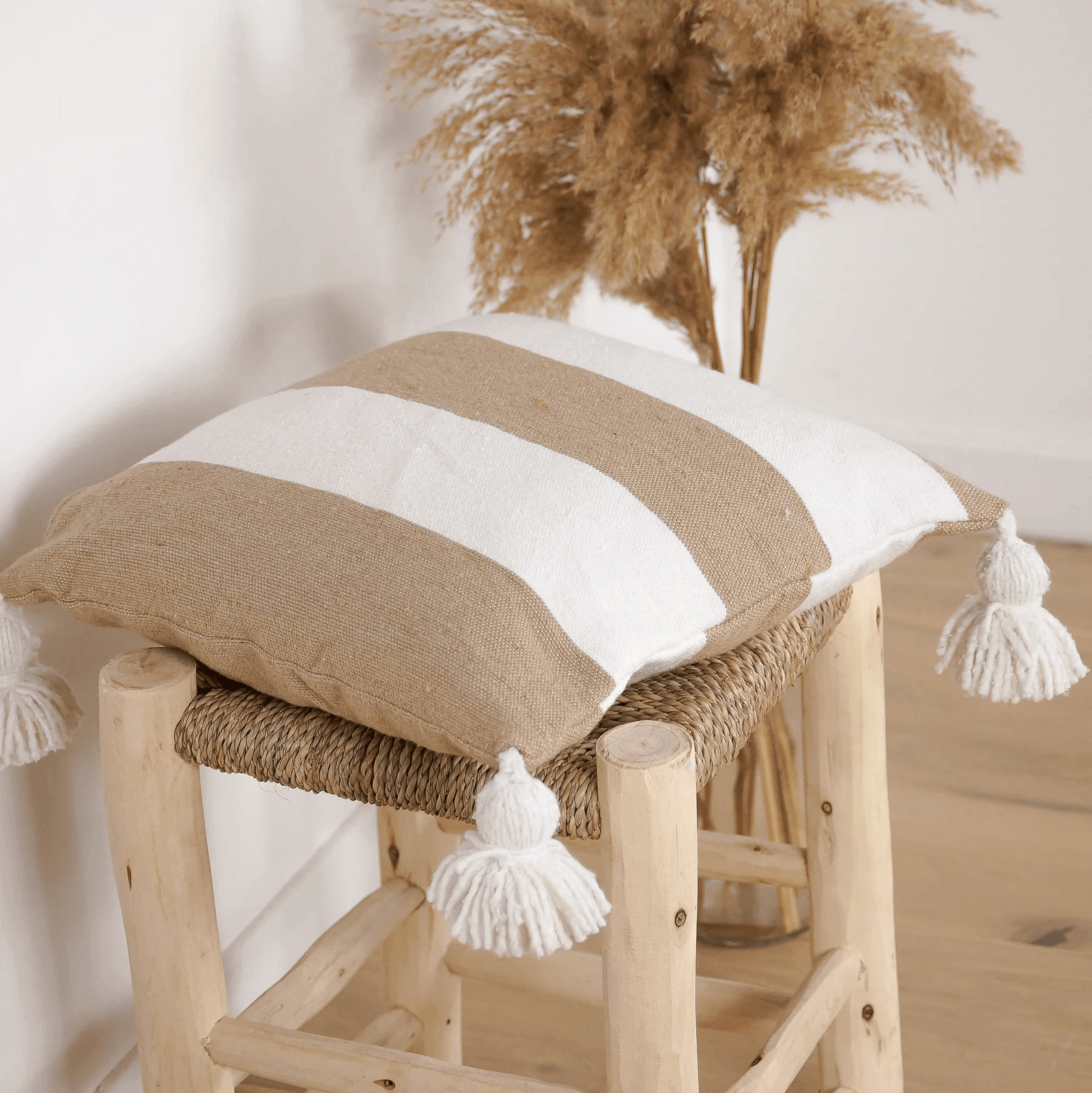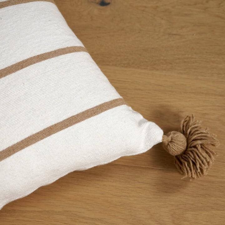 Coussin à pompons écru larges rayures camel